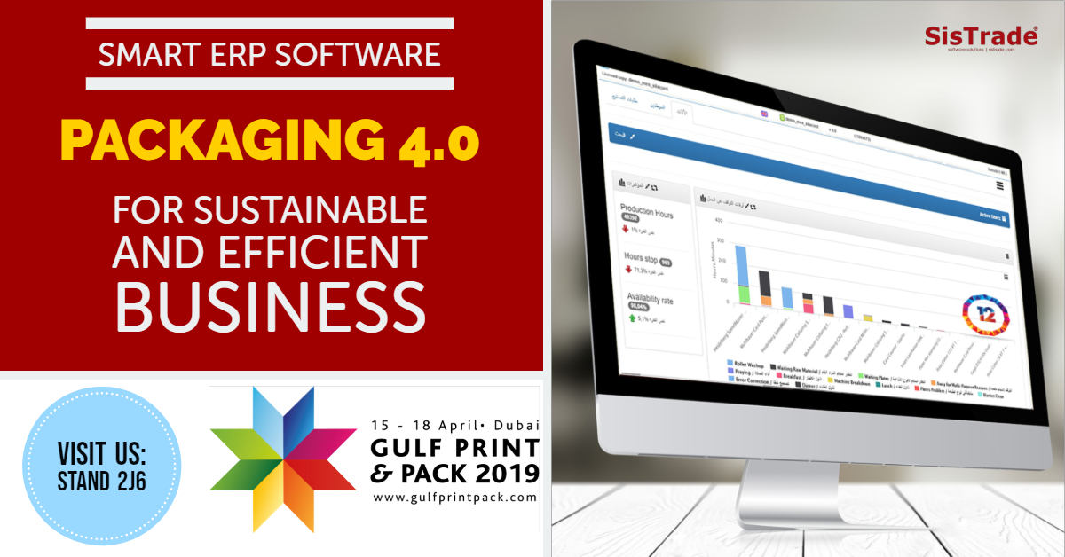 En la feria Gulf Print & Pack 2019 SISTRADE mostrará sus soluciones alineadas con los fundamentos de la Industria 4.0, harán un especial énfasis en la nueva versión del software Sistrade® V.12, así como a los nuevos Dashboards (cuadros de mando) que presentan las informaciones de forma apelativa en todas las áreas funcionales de Sistrade® MIS|ERP.